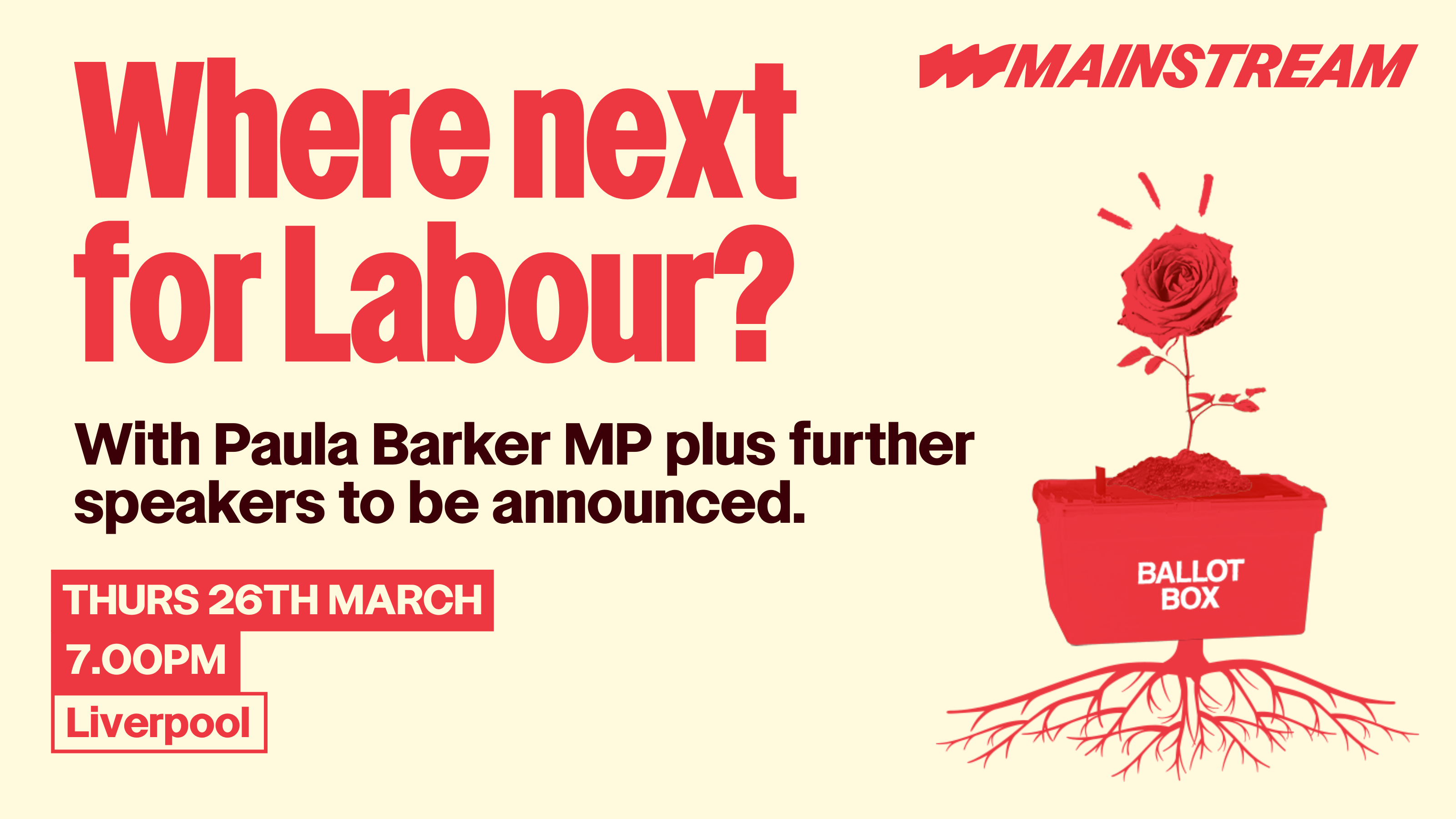 We're excited to be joined by Paula Barker, Labour MP for Liverpool Wavertree and a founding member of Mainstream, alongside further speakers - local and national - to be announced soon.