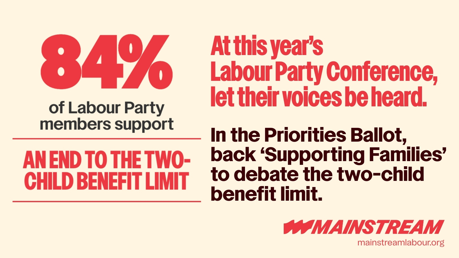 On 19th September, when Labour’s Conference Arrangements Committee (CAC) moved to block a debate on the two-child benefit limit, Mainstream moved to stop them. We directly supported several CLPs and affiliates in appealing the CAC’s decision, and hundreds of Mainstream members and supporters across the country told the CAC: Labour must choose differently on child poverty. On 22nd September, we won - the CAC reversed its decision. In the November Budget, we saw the fruits of this work, and all the valiant efforts of other campaign groups and civil society, when the Government finally ended the Tories’ cruel two-child benefit limit.